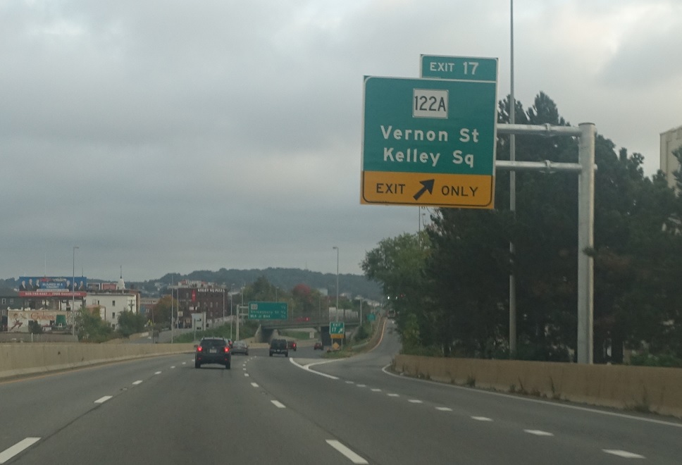 Reassurance shields as Mass. 146 traffic merges on. There must have been a sign replacement going on when I passed through in October 2021.