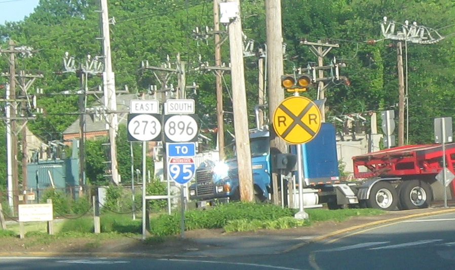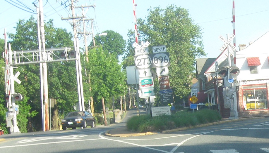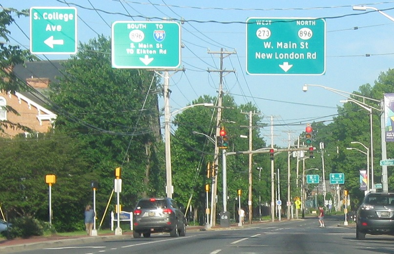 On the west side of downtown, we’ll approach DE 896. This is one of the more confusing junctions- involving a partial concurrency, though 896 north to 273 east involves sno concurrency at all. Delaware 896 north traffic joins right here, however, from College Avenue.