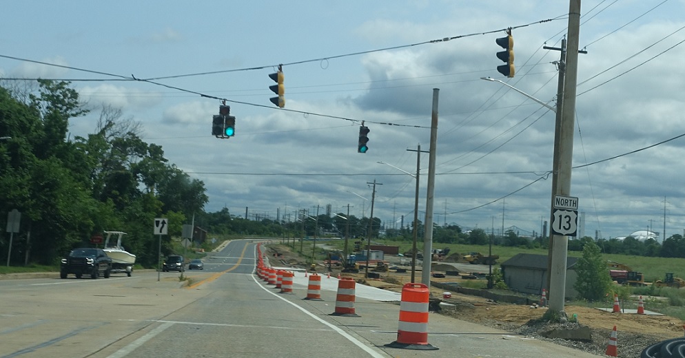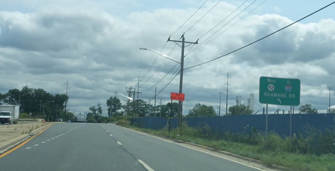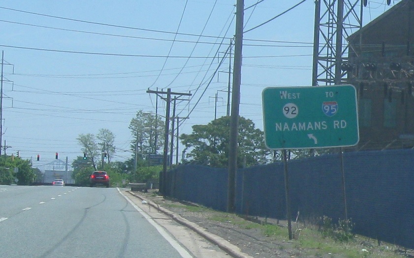 At the light, we’ll approach DE 92, which connects to I-95. The US-322 Commodore Barry Bridge in Pennsylvania comes visible in the background.