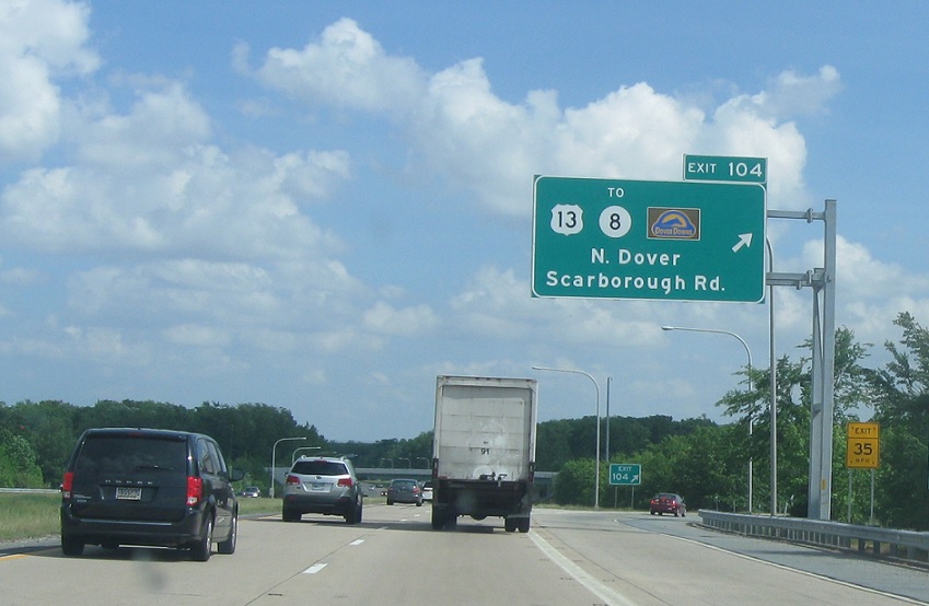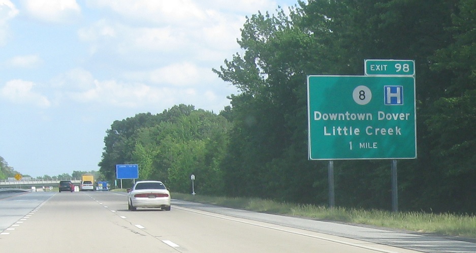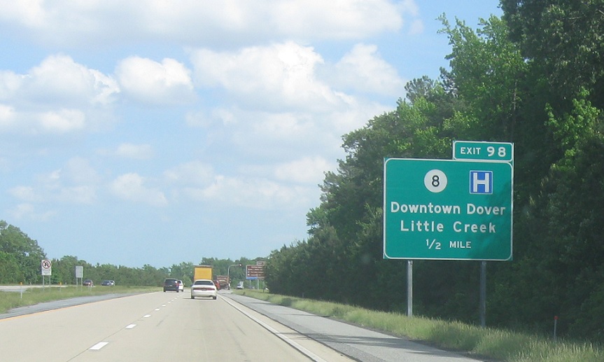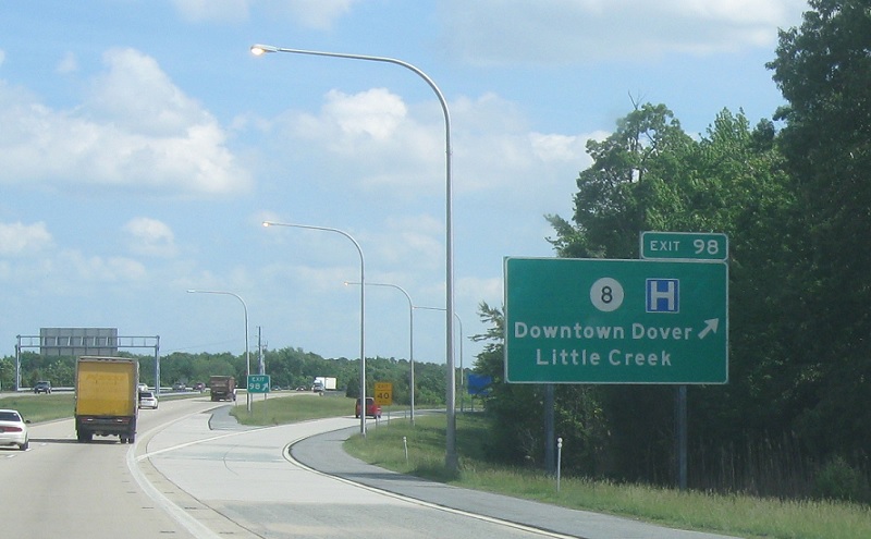 Exit for DE 8/Little Creek Rd, which heads to downtown Dover.