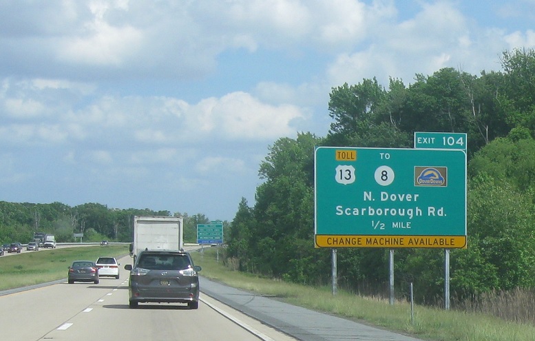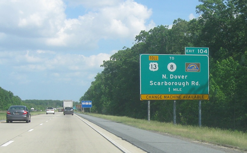 Follow Scarborough Rd to US-13 and DE 8. US-13 isn’t tolled, but there is a toll booth at the exit.