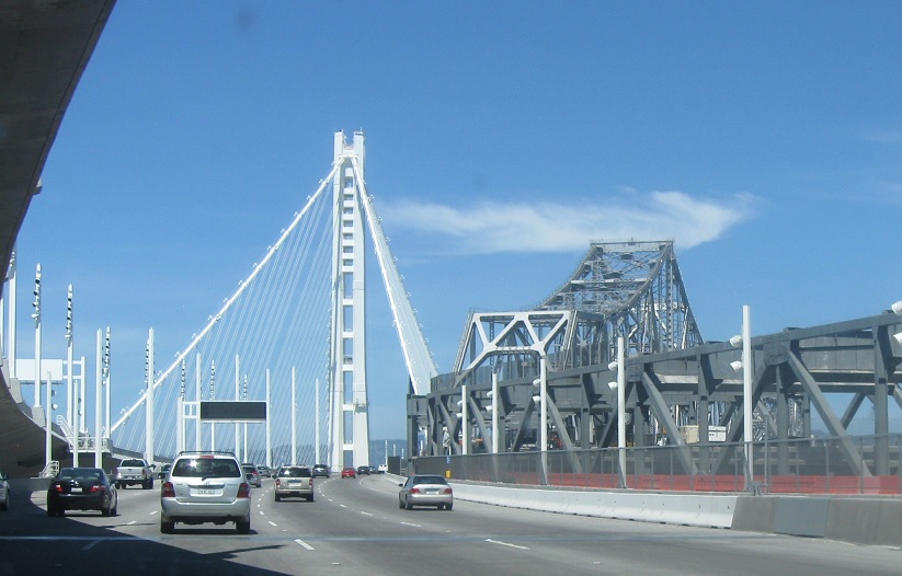 As we cross Treasure Island, we’ll come back up to the surface. The old Bay Bridge is visible to the right, from when this photo was taken in May 2014.