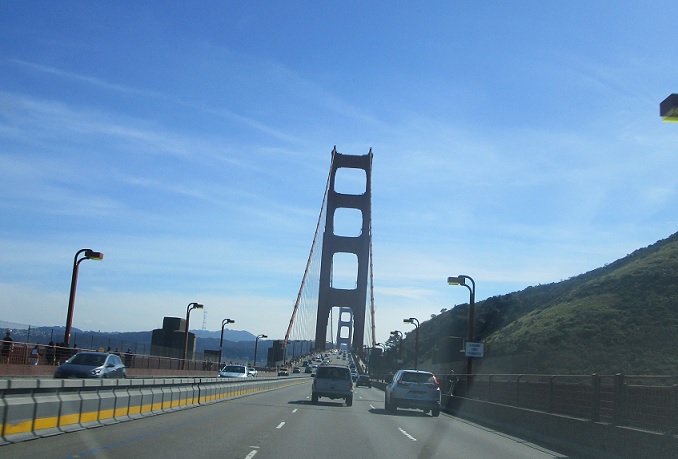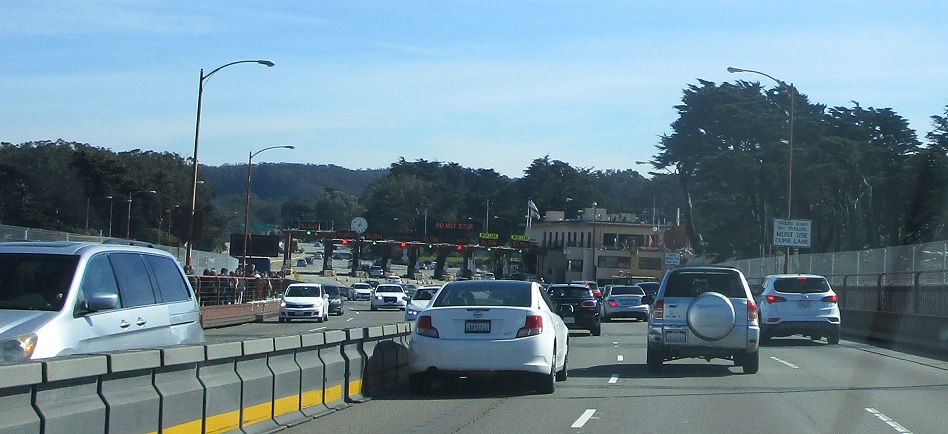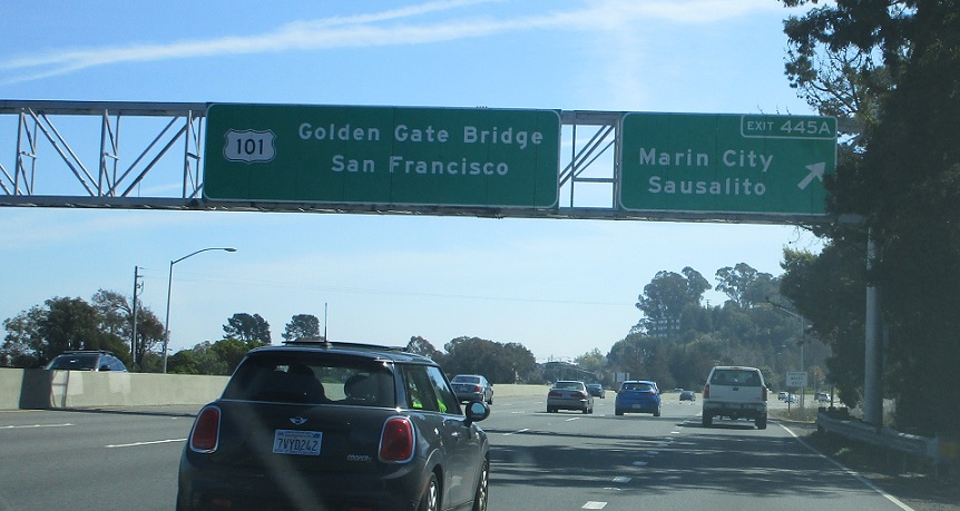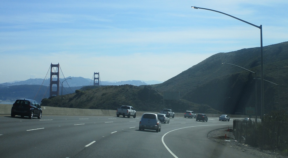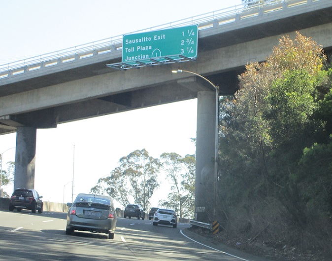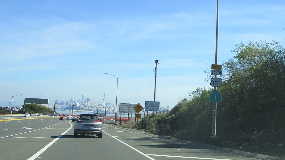 3.25 miles to the SR 1 split in San Francisco. The Golden Gate Bridge is tolled in this direction, with the tolls located on the south side.