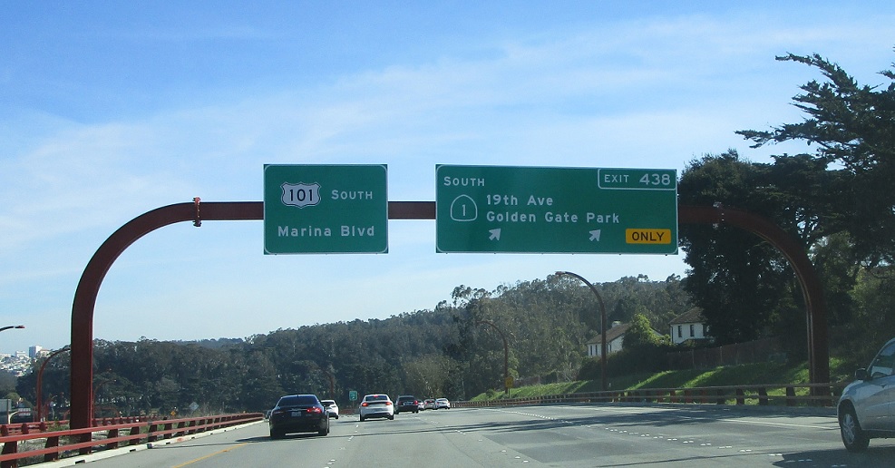 Just past the toll plaza, exit for SR 1 south, which heads into Golden Gate Park. 101 continues towards downtown.