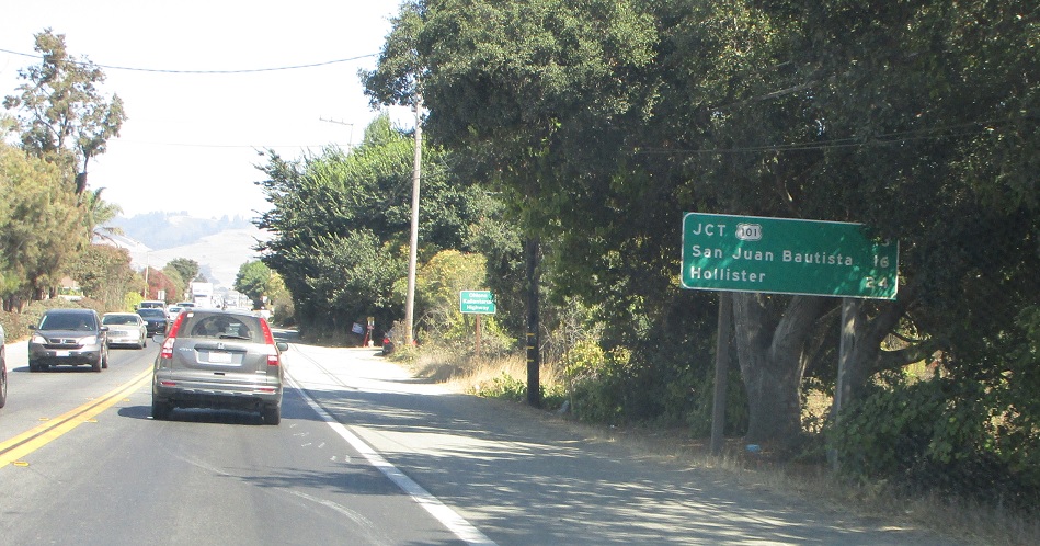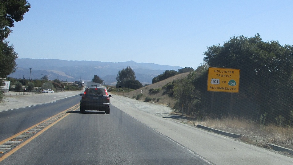 As we approach US-101, we’re advised to follow 101 to 156 instead of staying straight for an old US 101 alignment into San Juan Bautista.