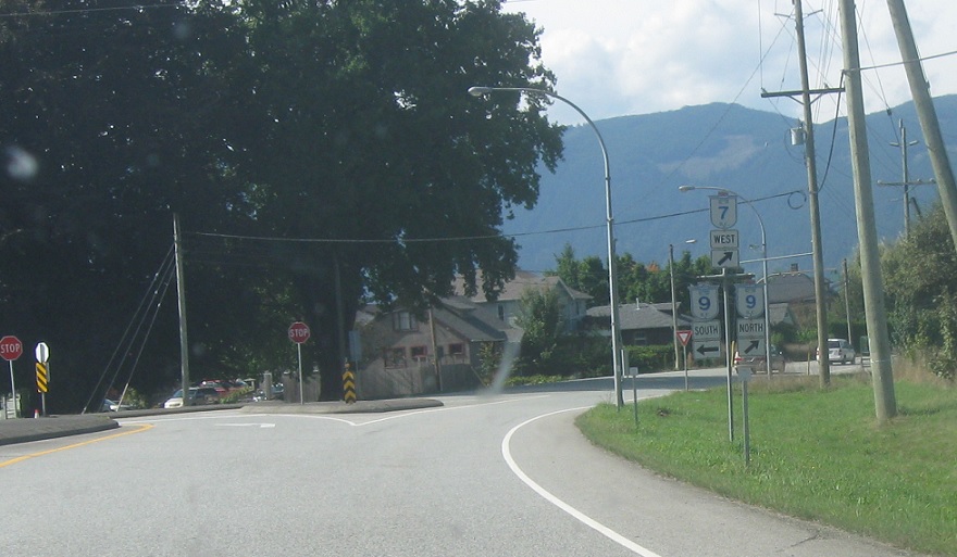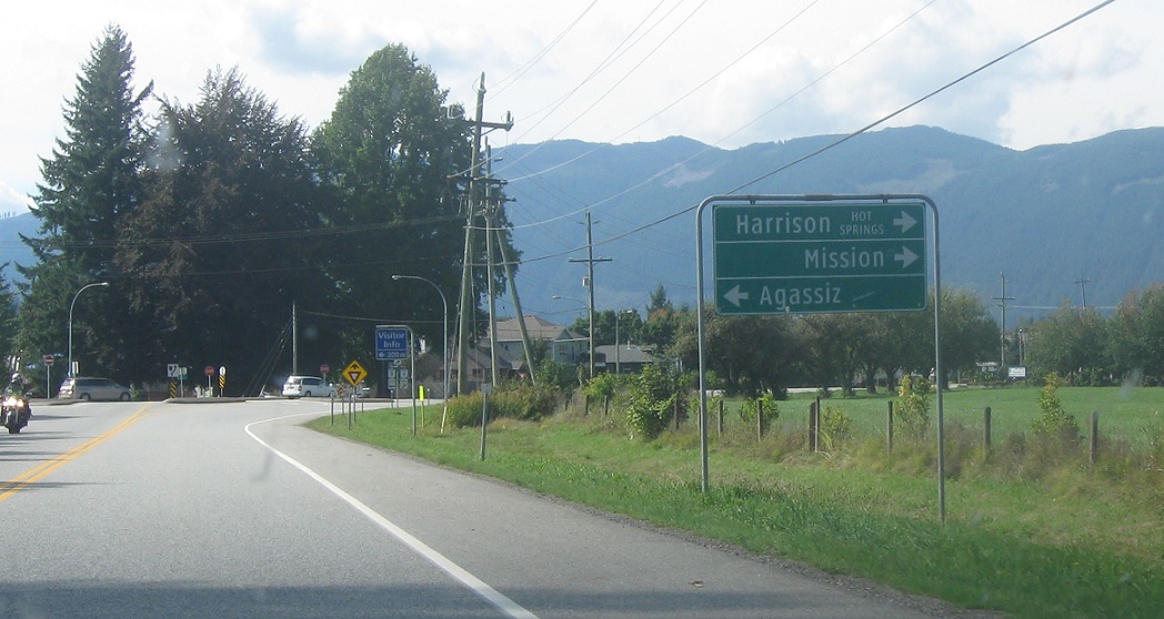 Turn left for 9 south into Agassiz. Keep right for 7 west/9 north towards Harrison Hot Springs and Mission.
