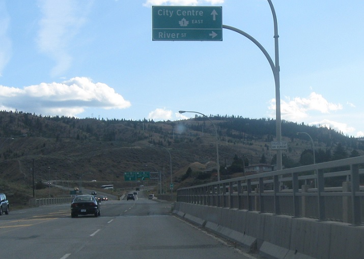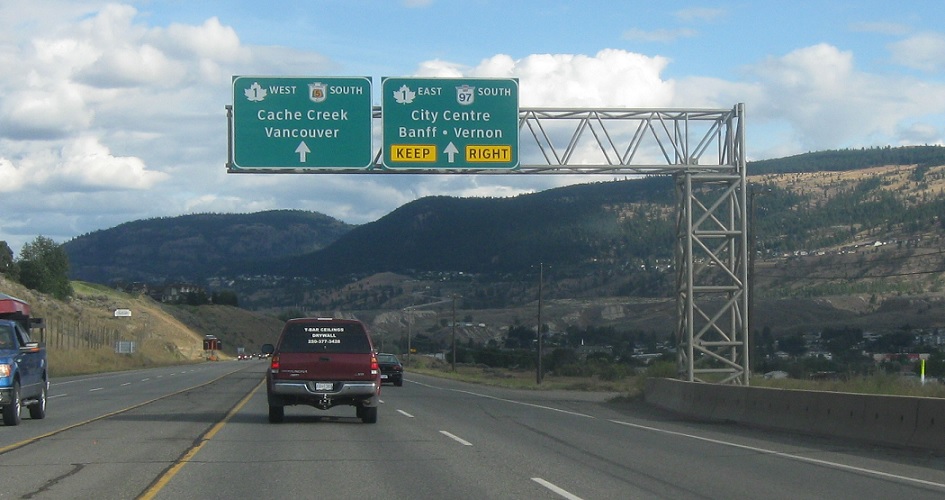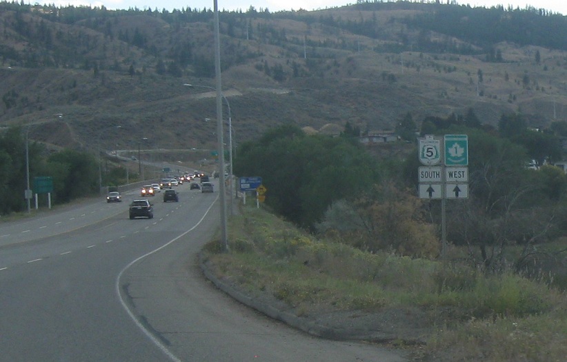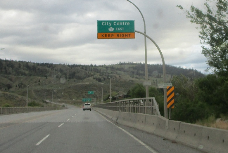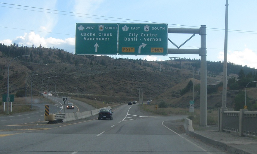 Exit for 1 east/97 south. Keep left for 1 west, 5 south, and unsigned 97 north. The three highways run concurrent through Kamloops.