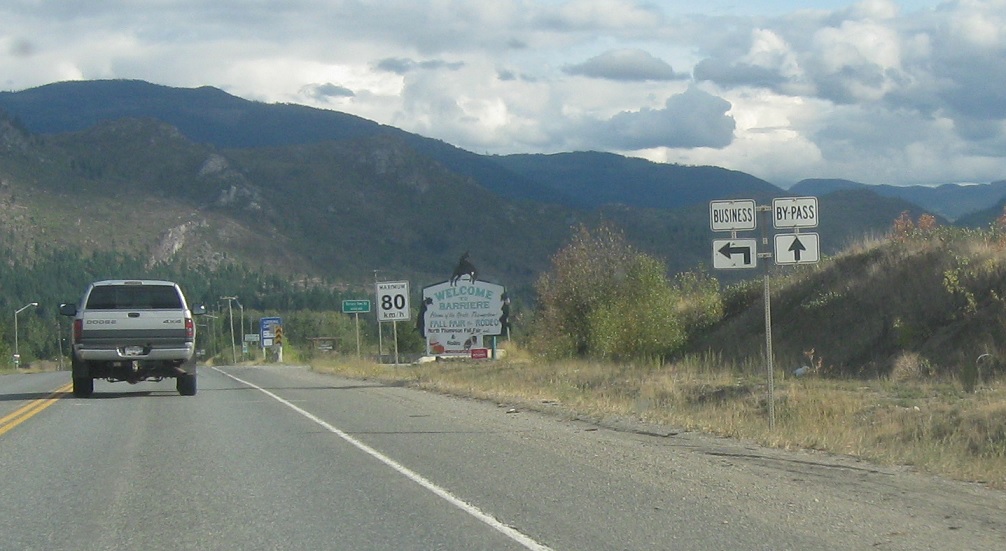 A few kilometers later we’ll enter Barriere. Follow these US-spec banners to choose how to navigate through town. The “by-pass” route is the only official BC 5.