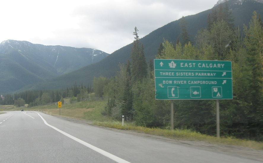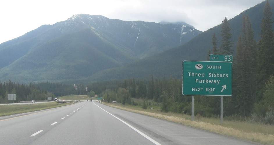 Exit ahead for Alberta 742/Three Sisters Pkwy.