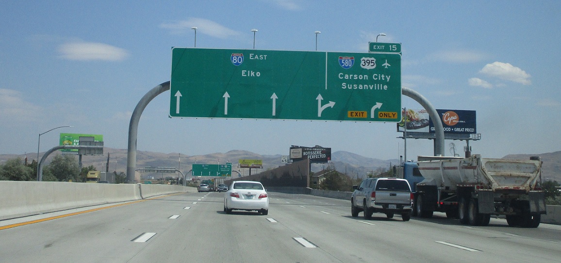 Exit ahead for I-580 and US 395. 395 north heads to Susanville, Calif., and 580/395 south heads to Carson City.