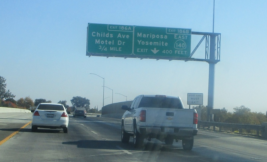 Just after SR 59 splits, SR 140 will split. Exit for 140 east to Yosemite. SR 99 Business rejoins.
