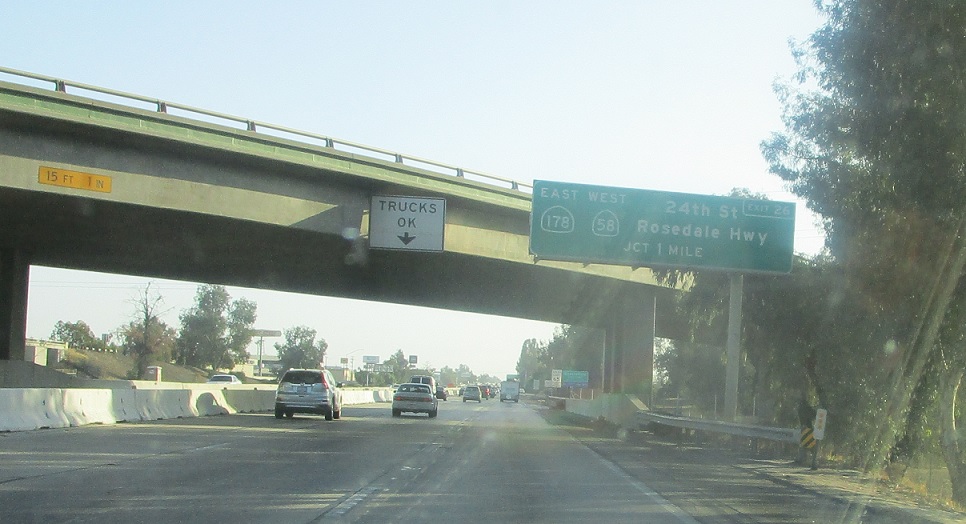 Exit for SR 178 east and SR 58 west. SR 58 east joins SR 99 south for a couple exits.