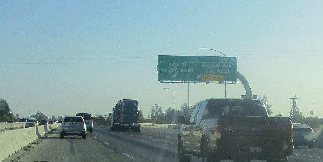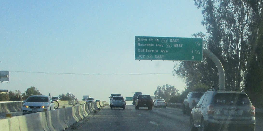 Exit in a quarter mile for various local streets which connect to state highways – Bakersfield took control of 58 west and 178 east, hence the “to” signage.