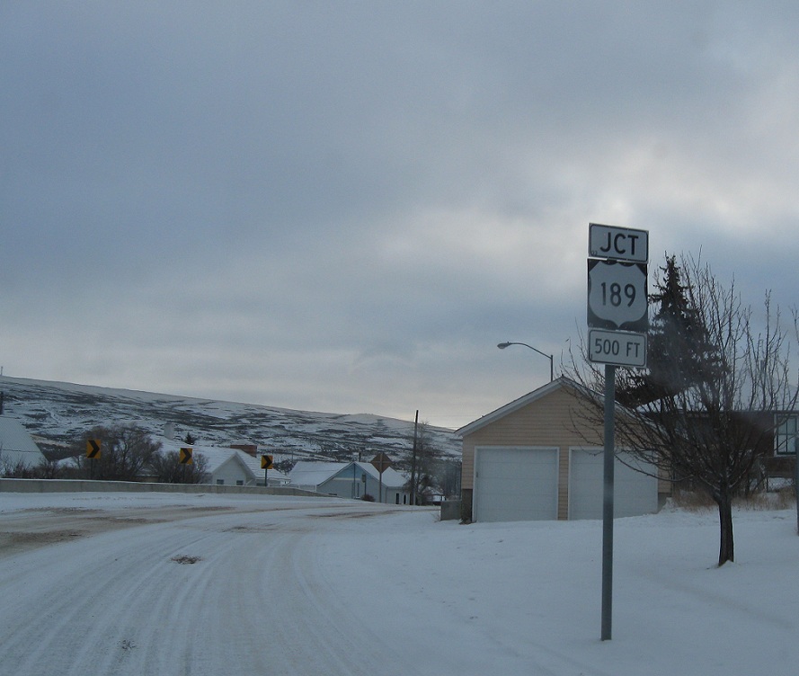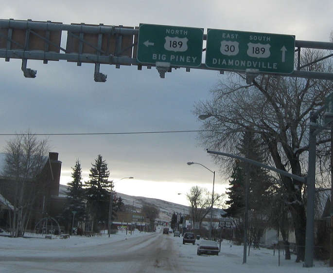 As we enter Kemmerer we come to the US-189 junction. 30 and 189 will travel together down to the bypass highway via Diamondville, or you can turn left for 189 North towards the national parks and Big Piney