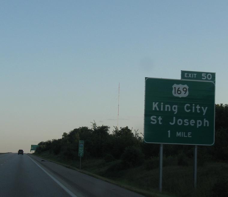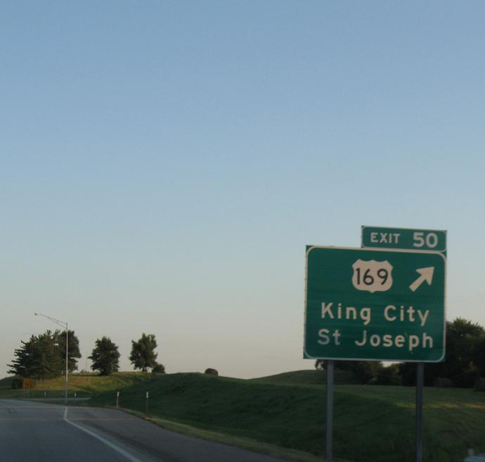 As we enter the city of St Joe, exit for US-169. 169 serves as a defacto I-29 business loop heading south, looping back to I-29 on the other end of town. 169 North heads up towards King City