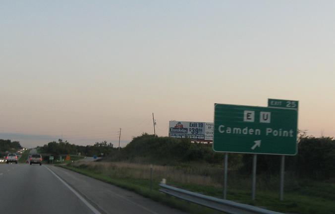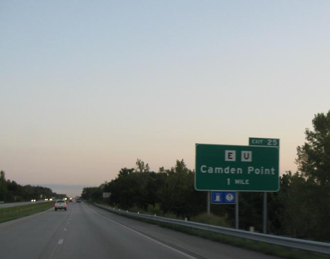 1 mile to E/U. E heads to Camden Point and beyond, U just heads over to Route 371
