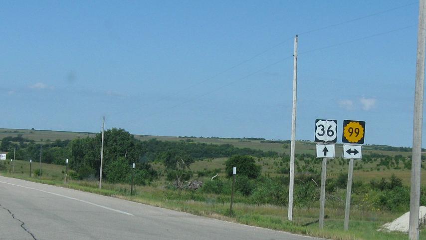 Straight for 36 West, right for K-99 North, left for K-99 South
