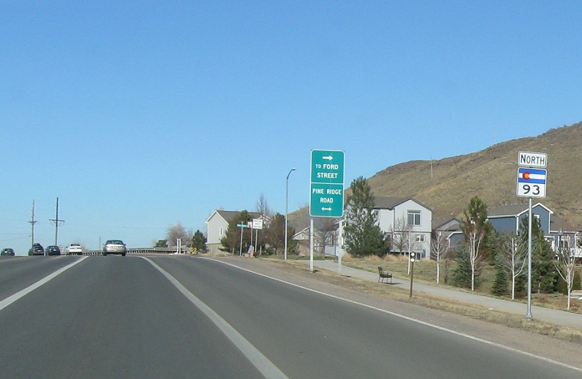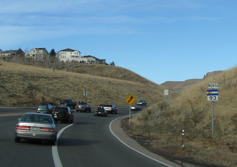Reassurance shield at the beginning of SH-93. 93 is an underbuilt road that serves traffic heading from Golden to Boulder- all the cars in front of me will soon be on a two lane undivided highway