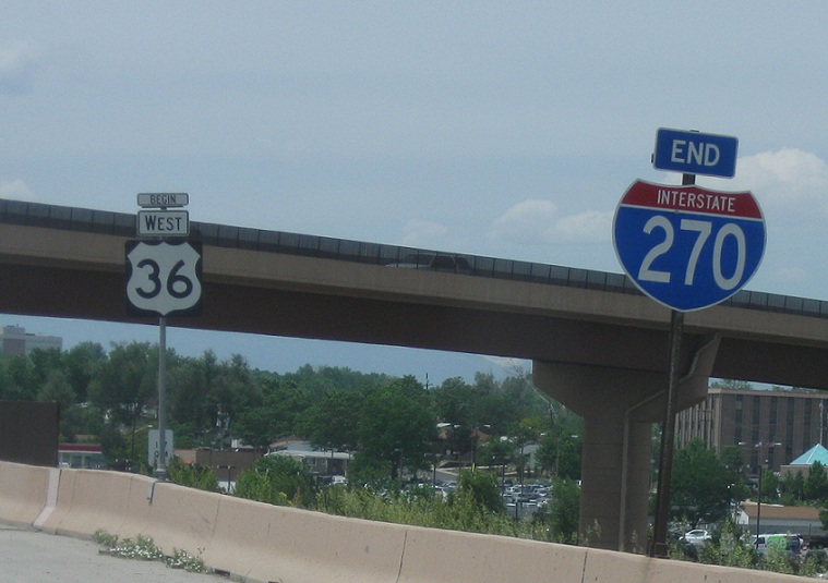 I-270 is signed as ending and US-36 “begins,” coming out of its unsigned shell