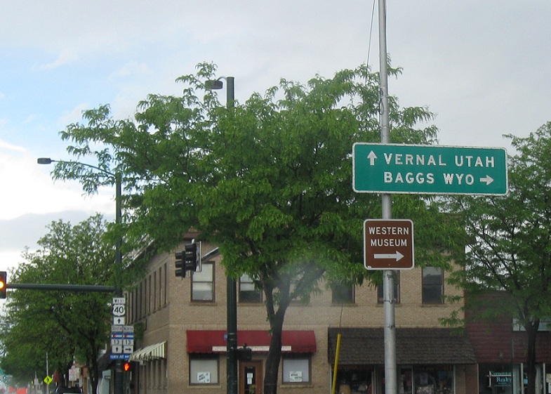Follow 13 North towards Baggs, Wyoming and 40 west towards Vernal, Utah on this rare for Colorado button copy sign