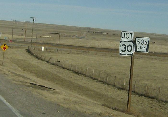 Link 53B is a very short route, carrying I-80 Business to US-30 which is less than a half a mile away from I-80. This is the only non-freeway sign for 53B. We’re already at the US-30 junction and there will be no signage at the junction. Turn left for 30 west through Pine Bluffs, Wyo. or turn right to stay on US-30 which runs independent from an interstate all the way across Nebraska