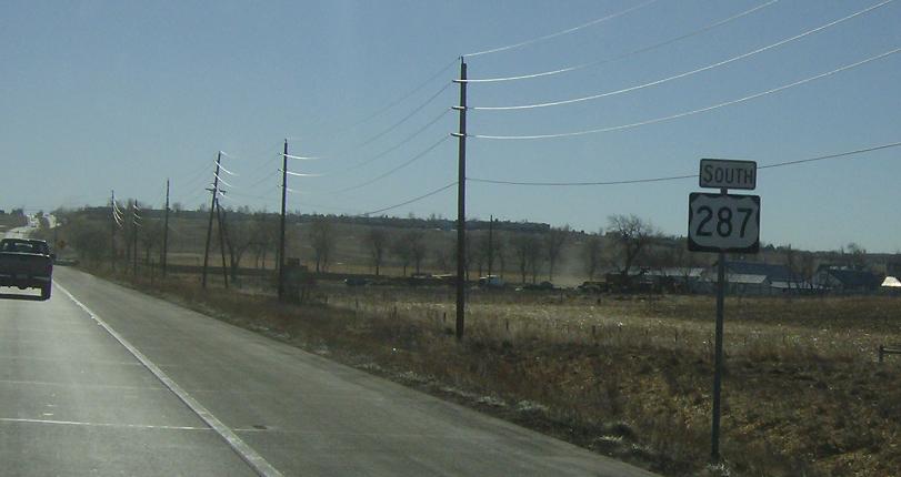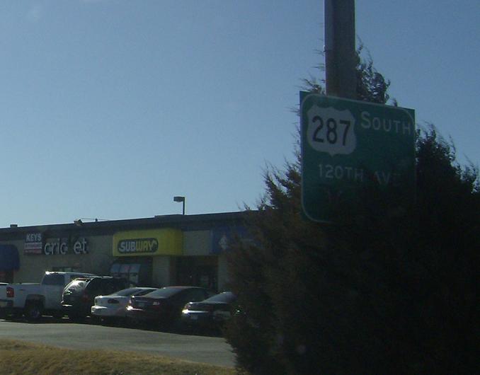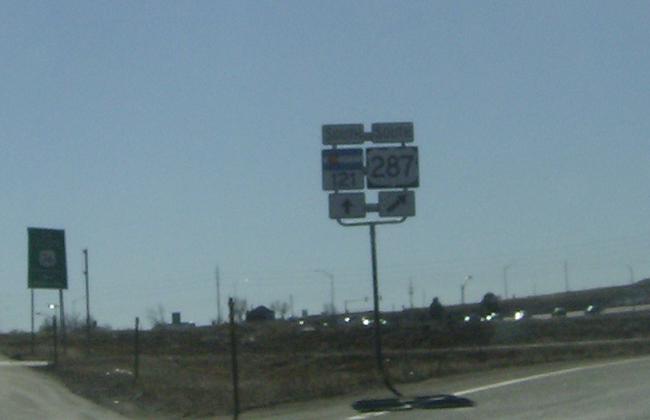 We come to a junction with SH-121 where US-287 will turn east down 120th Ave for a few blocks. This sign is effectively blocked by that shrub