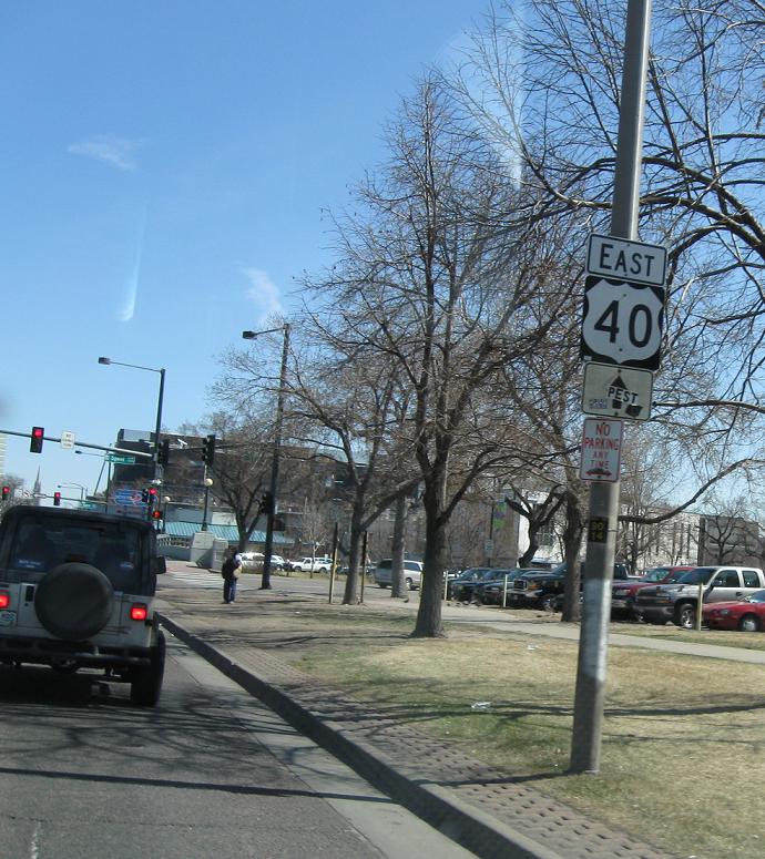 Reassurance shield for US-40 only as we enter downtown Denver. The capital of Colorado is visible in the background