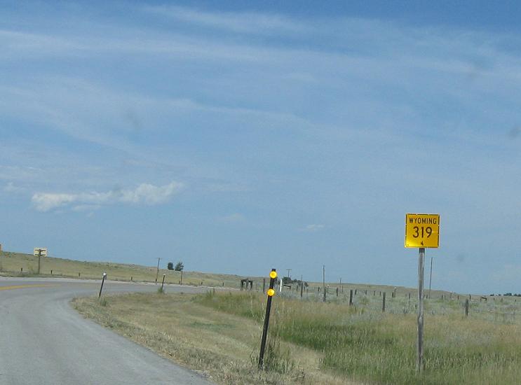 Turn left to follow unsigned WYO 319 spur over to the interstate, or stay straight to follow WYO 319 up to US-18/US-20 just east of their junction with I-25