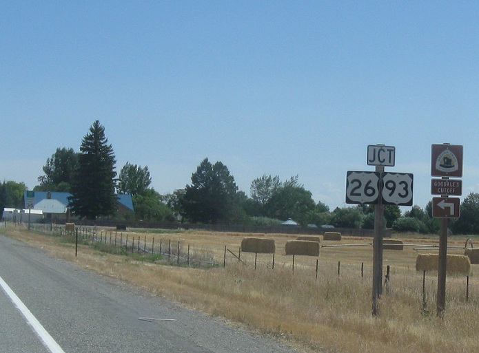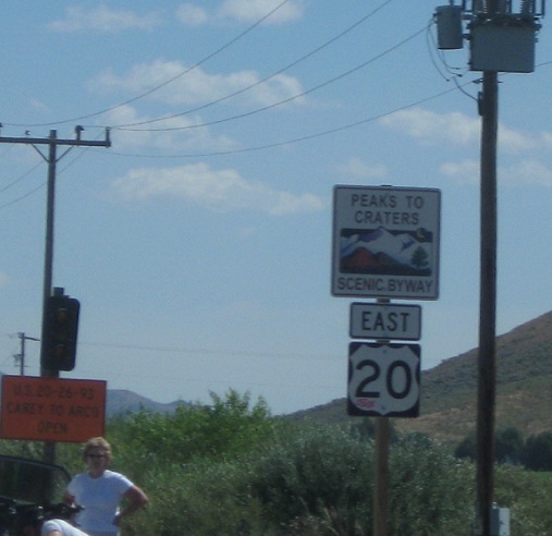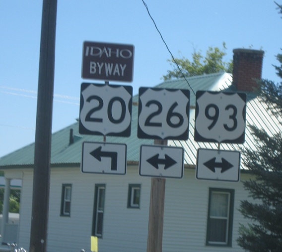 Turn left for 20/26 east and 93 north. Turn right for 26 west and 93 south. This intersection is likely the first ever installment of the IDAHO BYWAY signs that are being phased in to replace the brown scenic shields, so I zoomed in extra