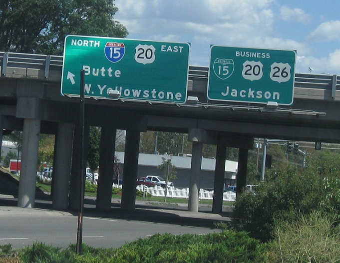 Exit left for I-15 North and US-20 East. The two routes will run concurrent to get out of Idaho Falls. Stay straight for I-15/US-20 Business TO US-26, which serves Jackson, Wyoming.