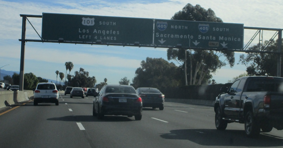 As we approach the I-405 San Diego Freeway, keep left to stay on 101 south.