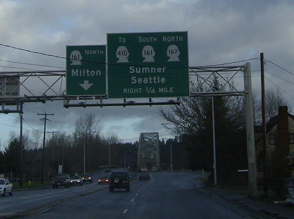 SR 167 turns left onto Meridian and comes up on a junction with SR 161. SR 161 North heads north, and SR 161 South and SR 167 North share a roadway west before splitting, forming a wrong-way multiplex