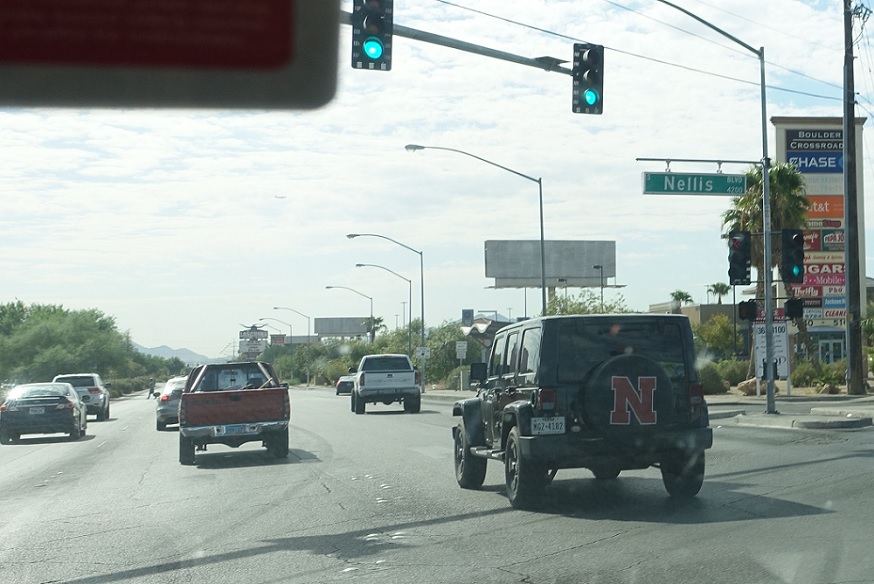 Immediately after 592/Flamingo, we’ll come to a sharp-angled intersection with 612/Nellis. Turn left for 612/Nellis north towards Nellis AFB and right for 612/Nellis south.