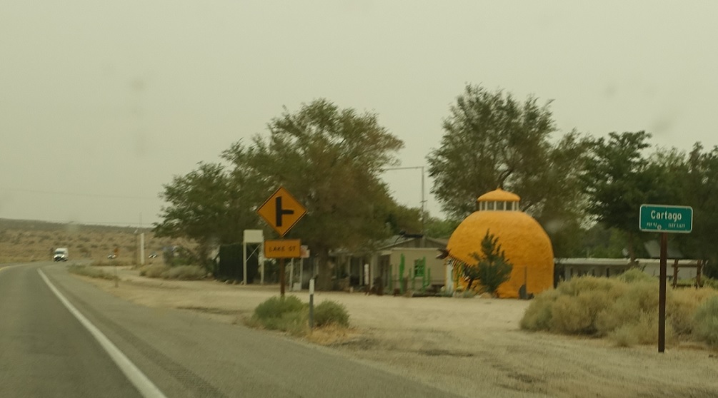 A few miles later, we’ll pass by unincorporated Cartago, home of a building that looks like an orange and allegedly sells beef jerky.