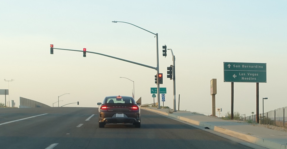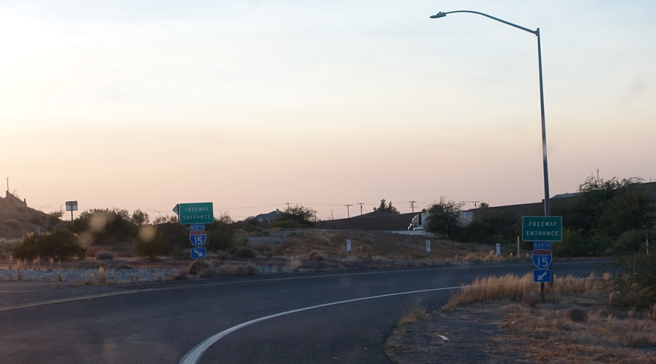 But first, we’ll approach I-15. Stay straight and turn left for I-15 south to San Bernardino. Turn left for I-15 north to I-40, Las Vegas, and Needles.