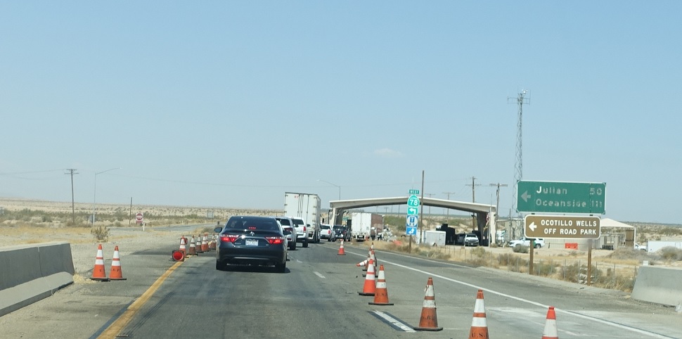 SR 78 splits just past the fascist checkpoint. Follow 78 west to Julian and Oceanside.