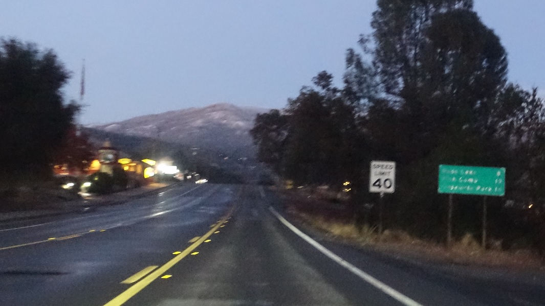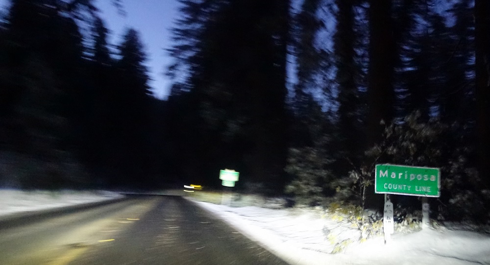 Not much signage along this rural segment, but several miles later we’re up into snow territory and we’ll enter Mariposa County.