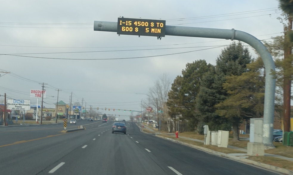 As we enter Murray and approach US-89, we’re advised that it will take five minutes to get to 600 south (SR-269) via I-15 north once we get to the interstate.