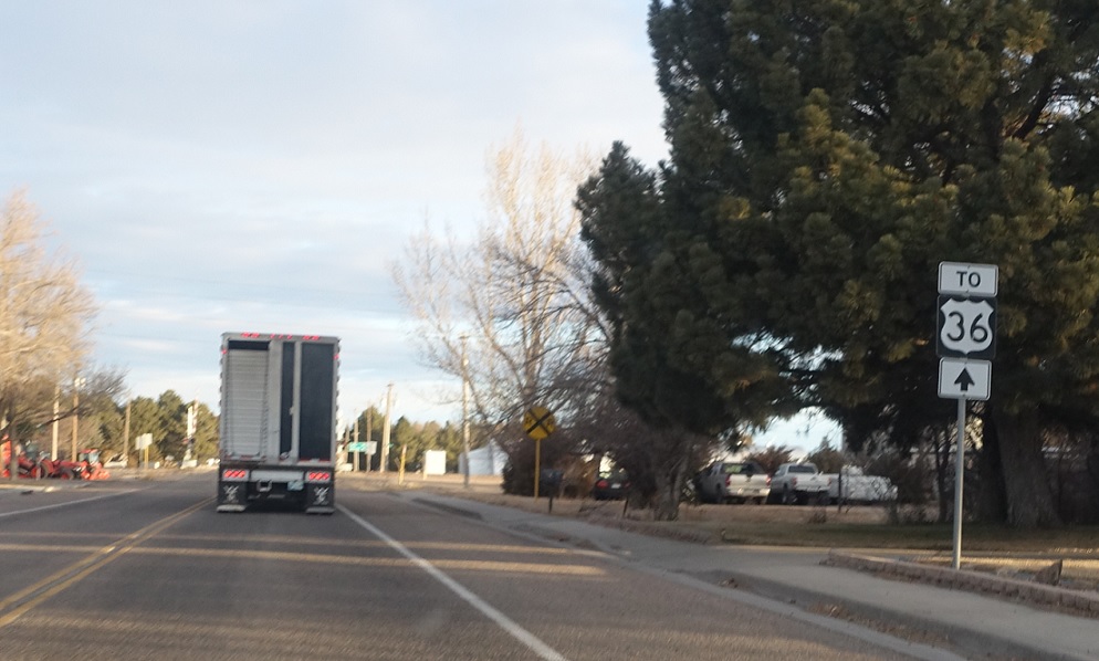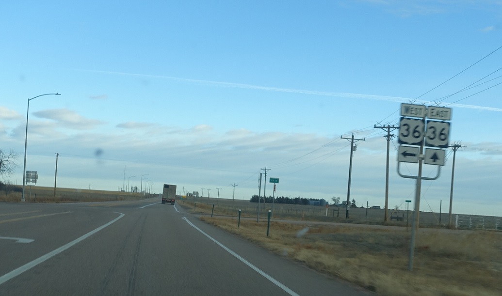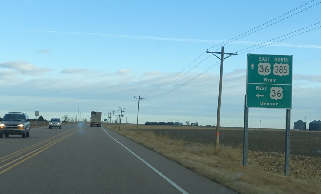 A few miles later, we’ll approach US 36. Follow 36 west to Denver. 36 east briefly joins 385 north as 385 heads to Wray.
