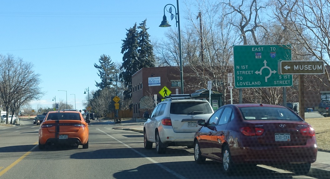 As we pass through downtown Berthoud, we’ll approach a roundabout at 1st Street.