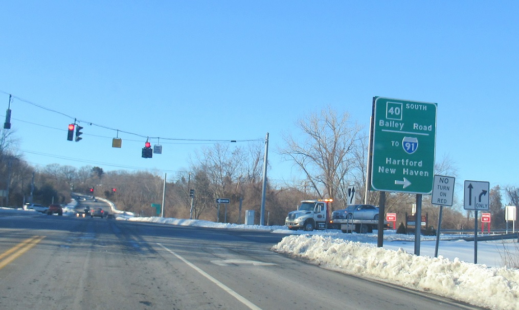 Immediately as SR 717 begins, we’ll approach CT 40. Turn right for 40 south to I-91, Hartford, and New Haven. SR 720 exists on the other side of the highway for the US 5 to CT 40 northbound connection.