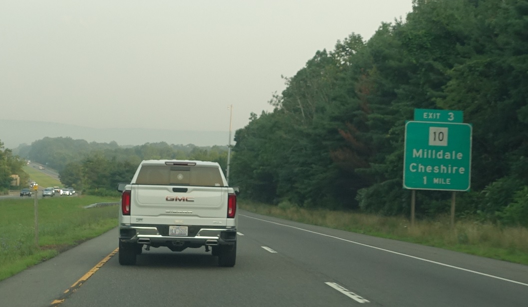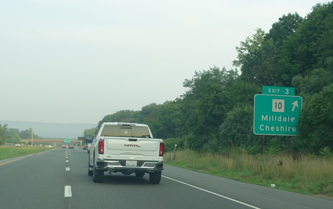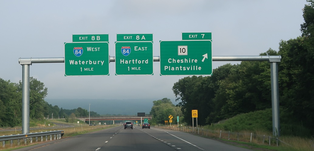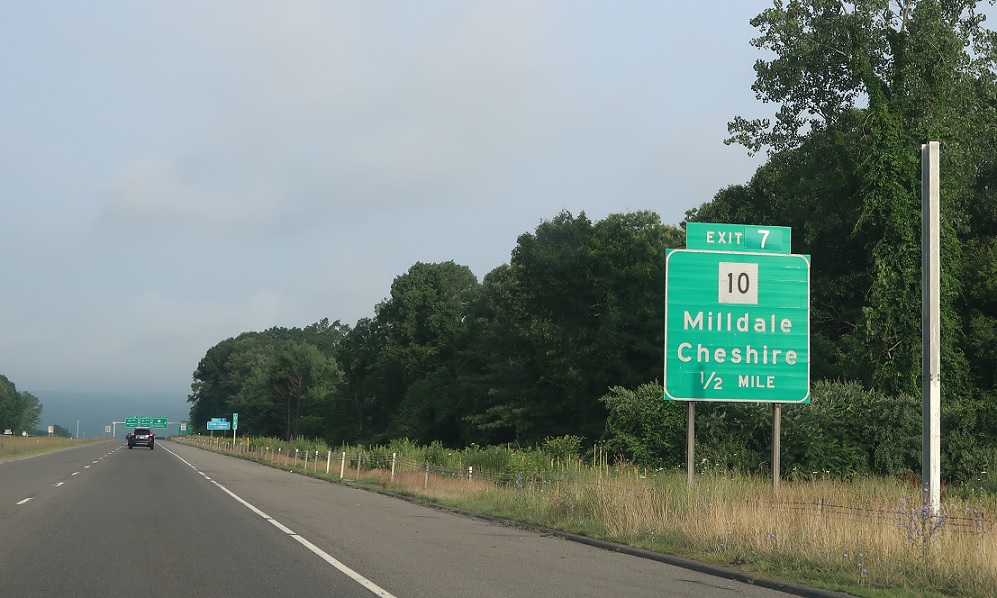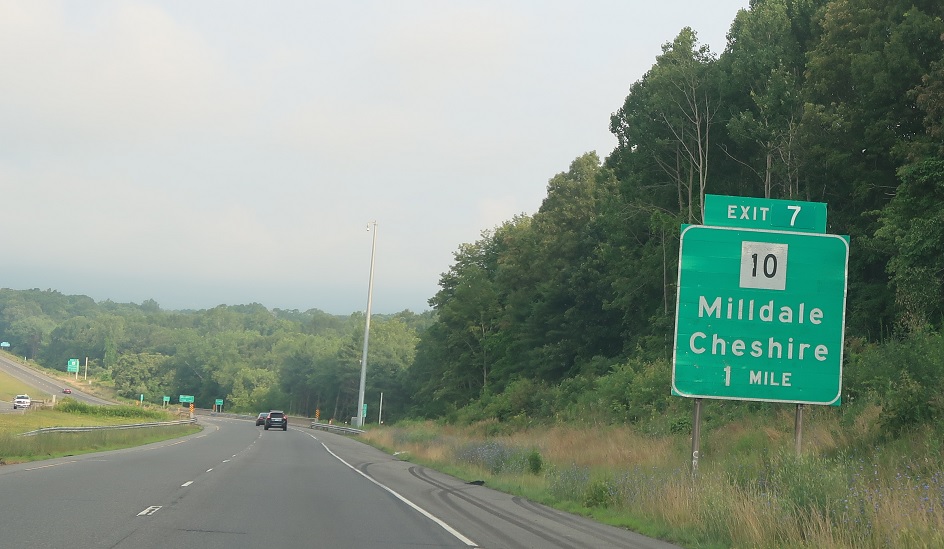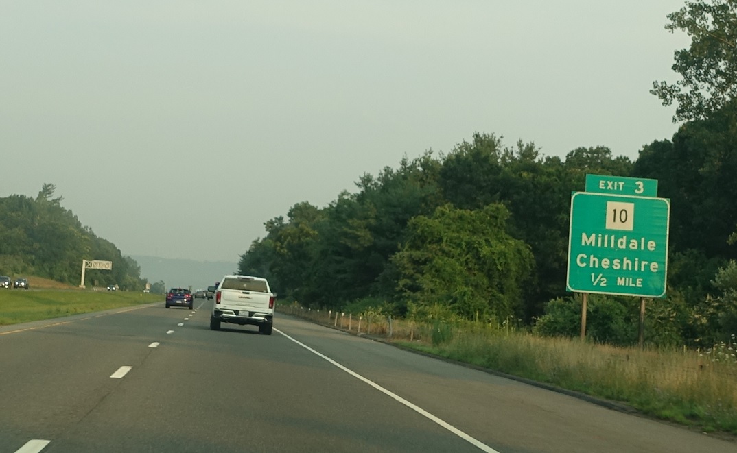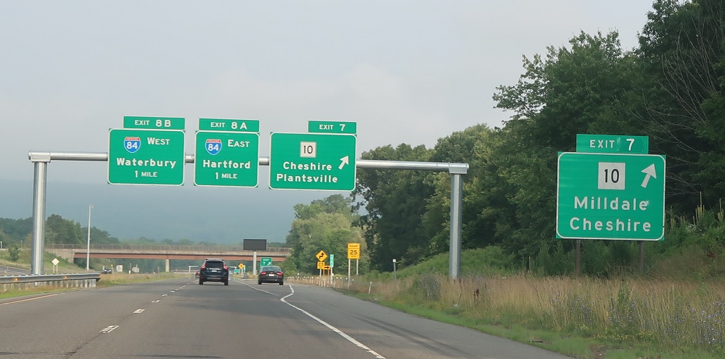 Exit for CT 10 as we’re one mile from I-84. Connecticut has been aggressively removing gantries from overpasses, starting in 2022, so advance notice for I-84 has moved up a bit.