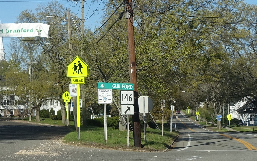 As we pass through downtown Branford, where every street is Main Street, keep right for CT 146 east. Keep left to head back to US 1 and Guilford – though 146 also goes to Guilford.