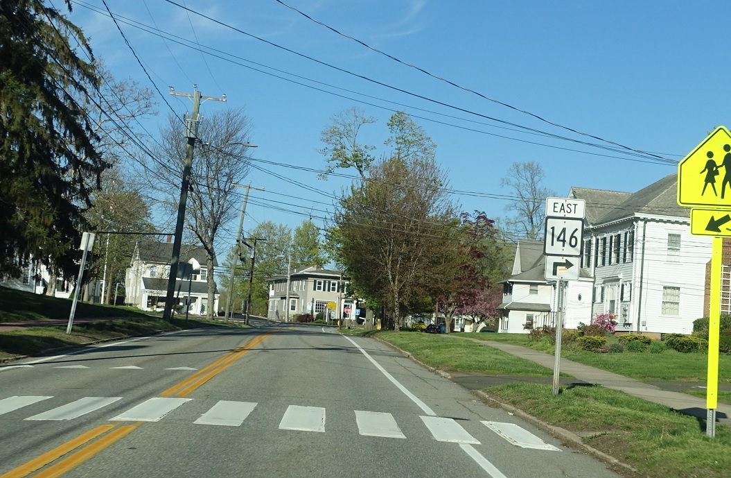 146 goes weird here – it makes a quick unsigned left and then a right on the south side of the Guilford Green. Stay straight for 77 north.