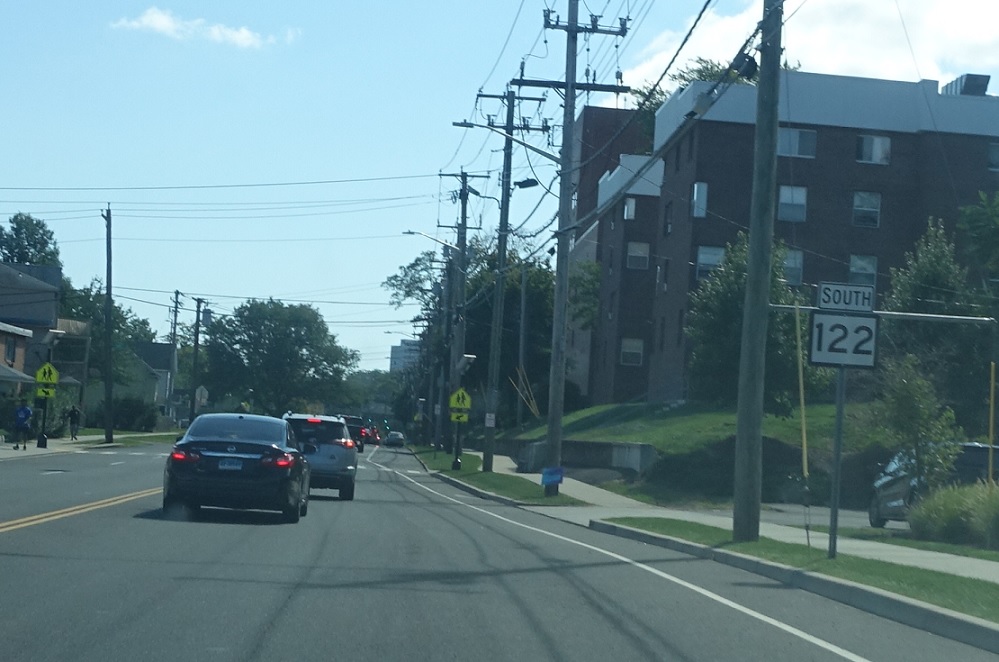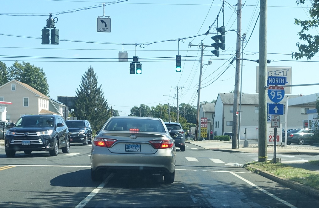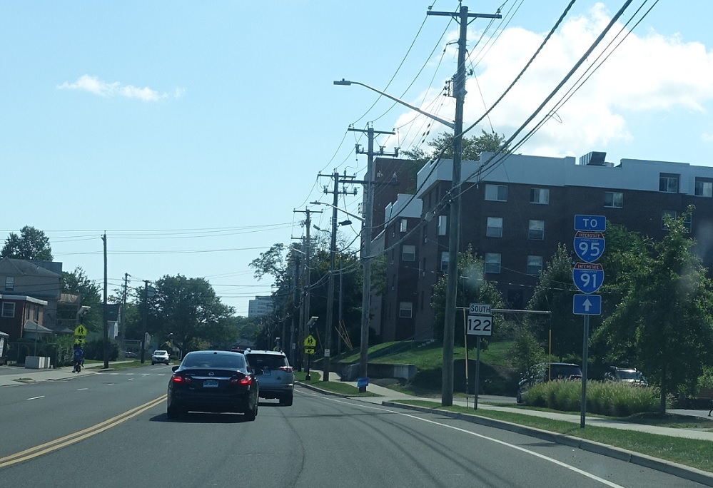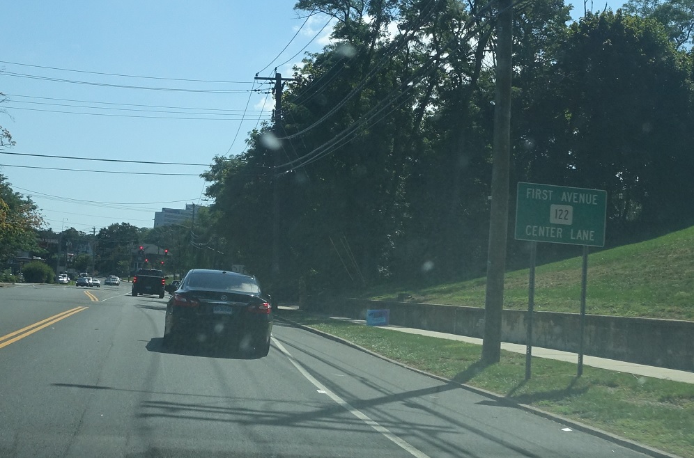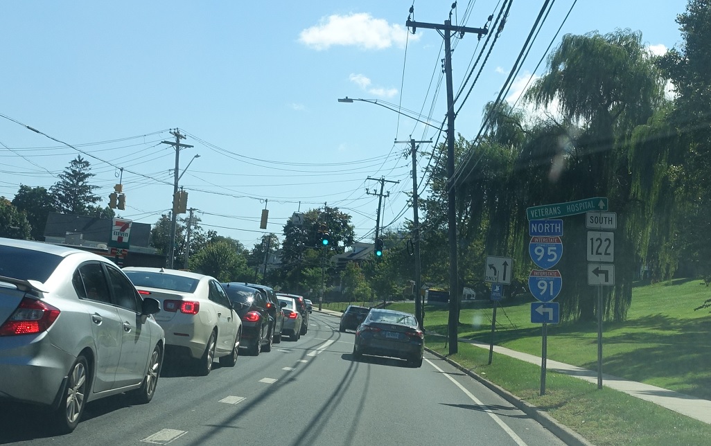 At the light, turn left for 122 south to I-91 and I-95 north. I am in the wrong lane.
