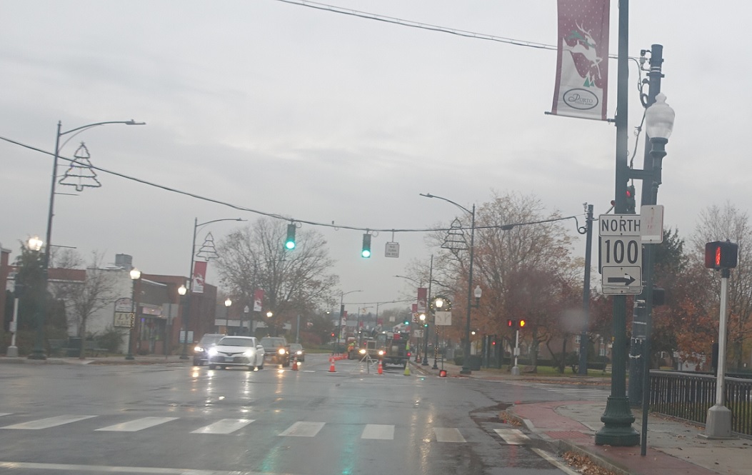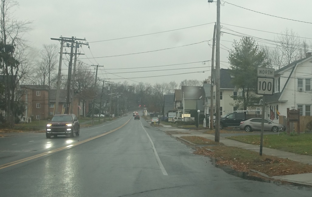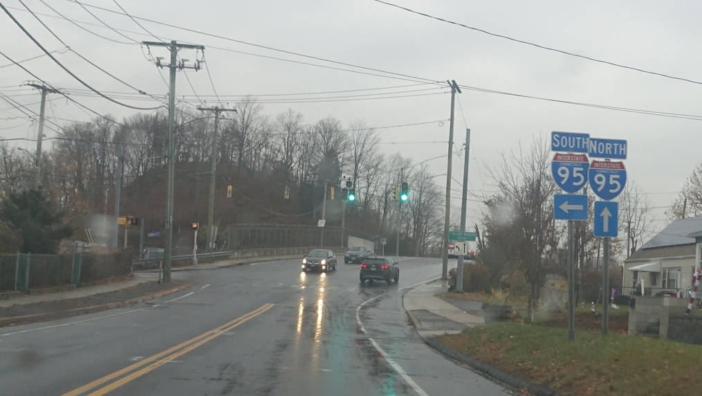 There is no direct connection between 100 and US 1 here. Turn left at the light for SR 735 to US 1 and I-95 south. Stay straight to connect to I-95 north via CT 100.