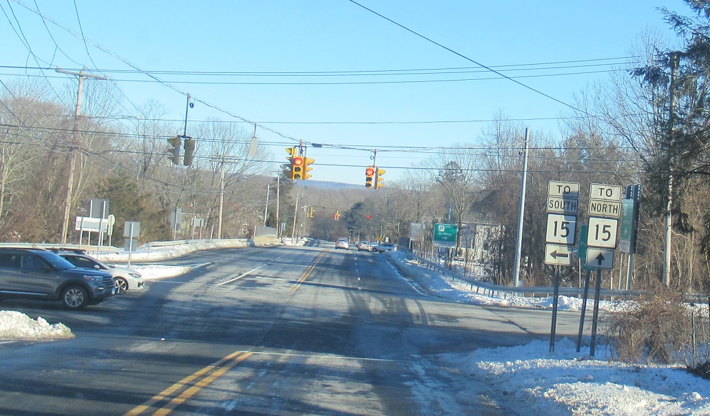 A half mile later, we’ll approach CT 15. Turn left for SR 725, which carries the ramp to CT 15 south. Turn right ahead for CT 15 north towards Hartford.