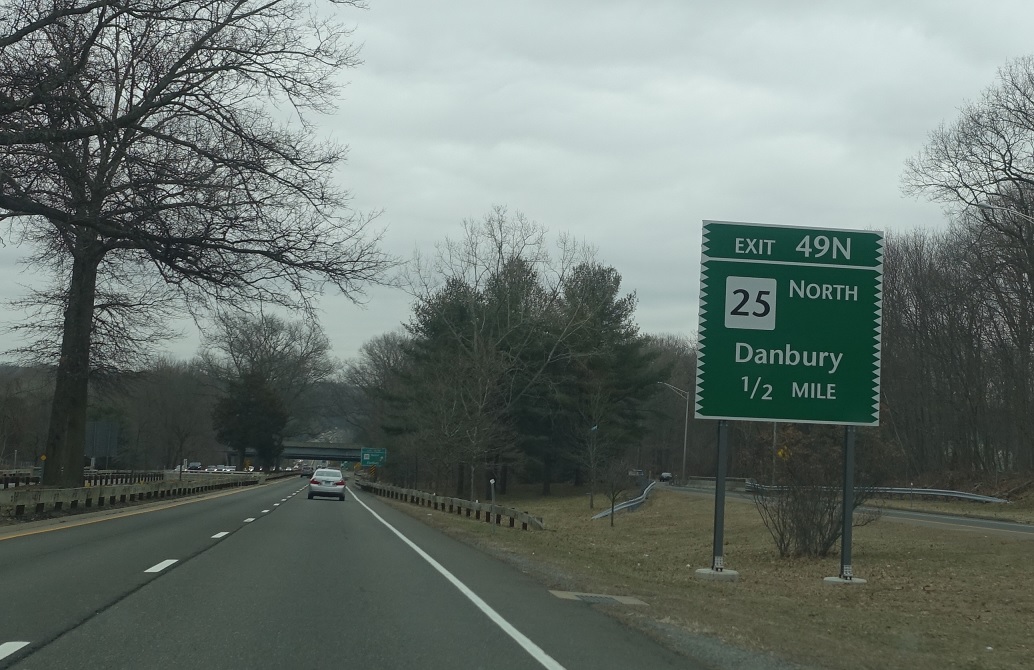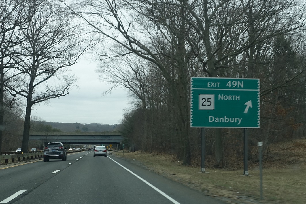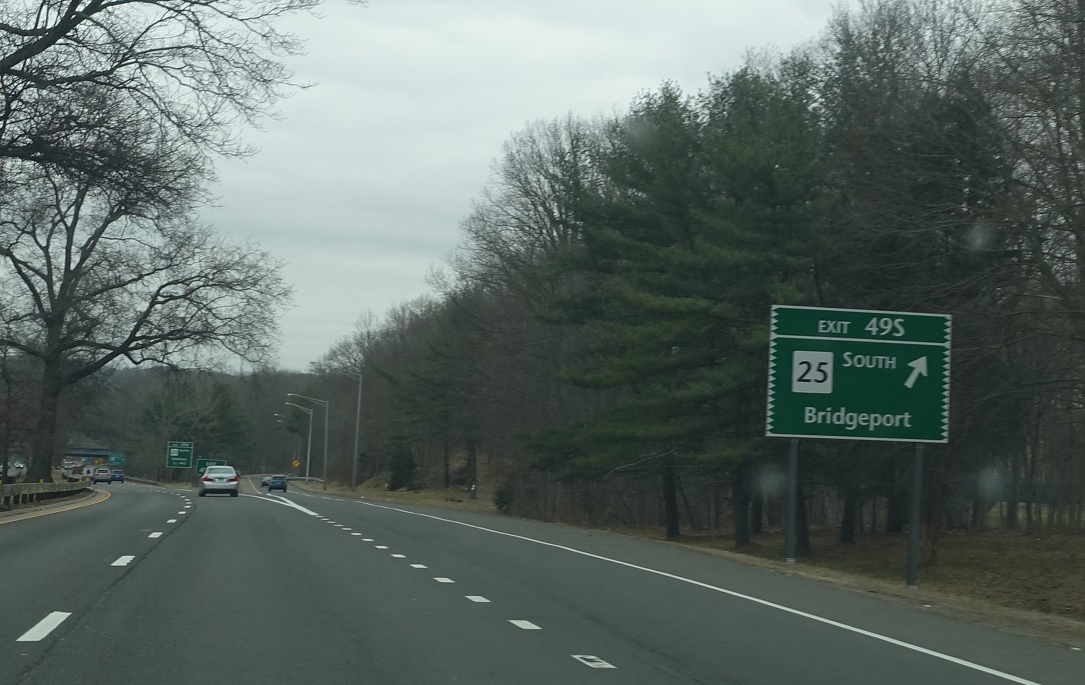 Exit for CT 25 north to Danbury. Up ahead, traffic from CT 127 will merge on. There is no access to 127 from CT 15 north – all other movements in this interchange except CT 25 south have access to 127.