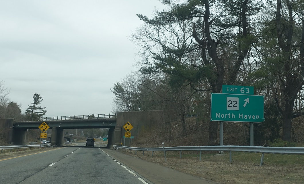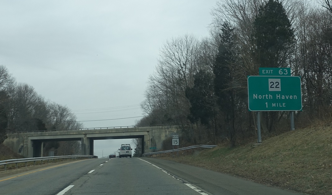 Exit for CT 22, which heads towards downtown North Haven. SR 725 facilitates movements from CT 22 to CT 15 south and vice versa.