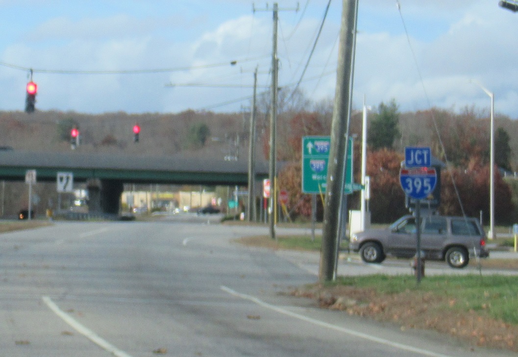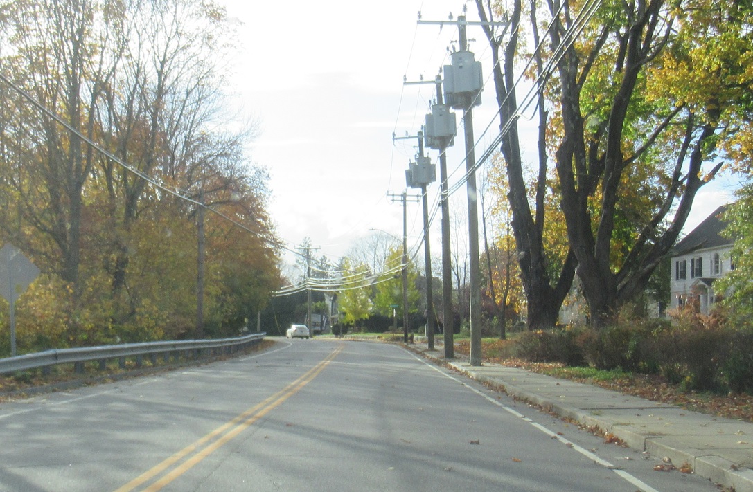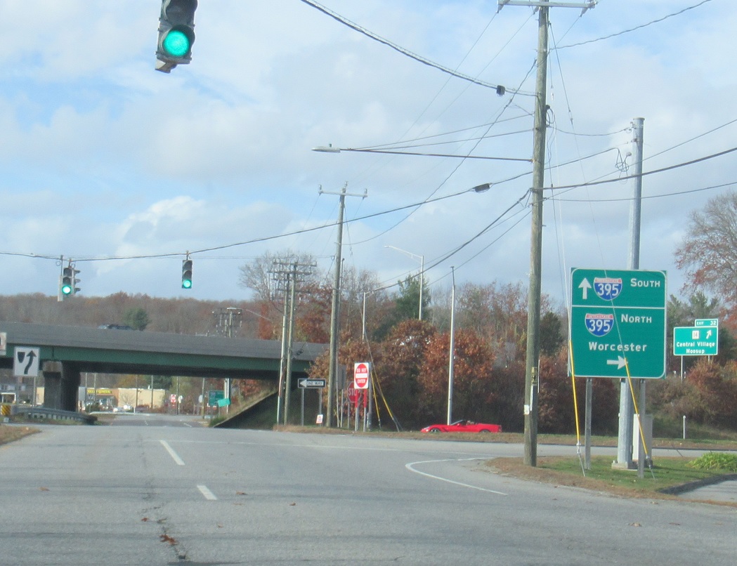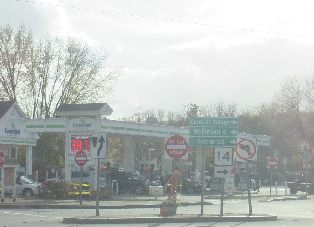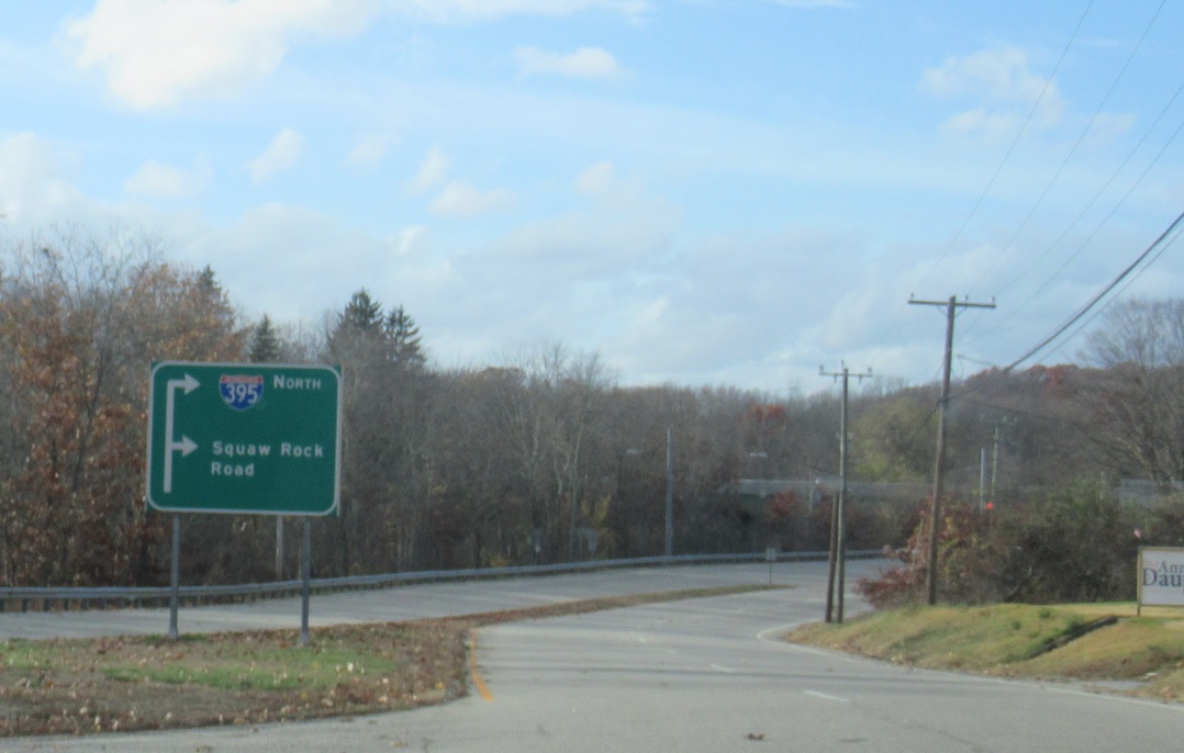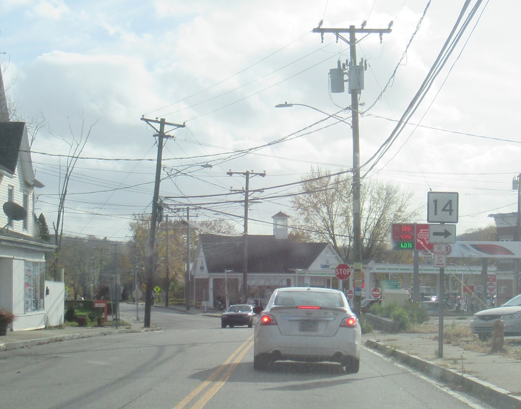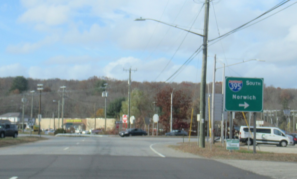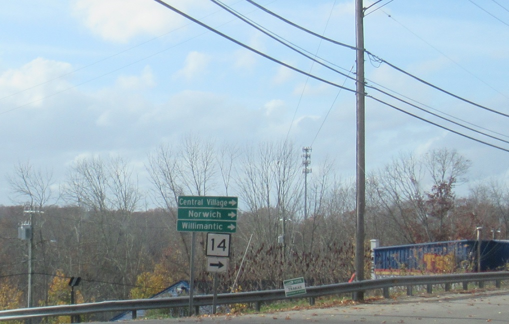As we cross under I-395 we’ll enter Central Village. Turn right for I-395 south to Norwich. Stay straight to stay on CT 14 west.